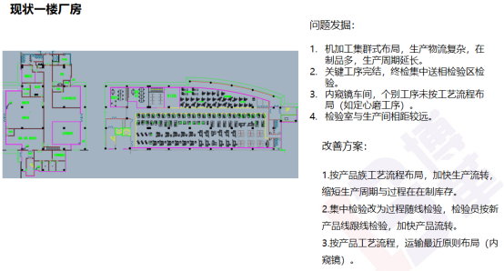 根据现状调查和分析,博革咨询认为,先合理规划各楼层功能,再打造连续流的生产方式,降低成本金额,核心工作是要缩短生产周期、降低中间wip,提高生产效率,改善现场环境。