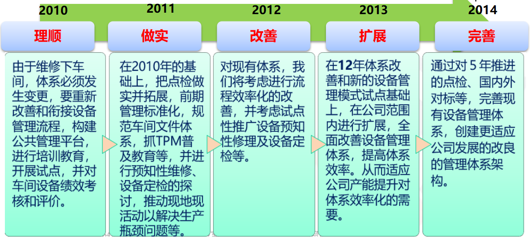 上海普华tpm围绕着效率化维修战略,本着循序渐进,一步一个脚印的原则进行五年规划,按照2010年理顺、2011年做实、2012年改善、2013年扩展、2014年完善的计划进行辅导;