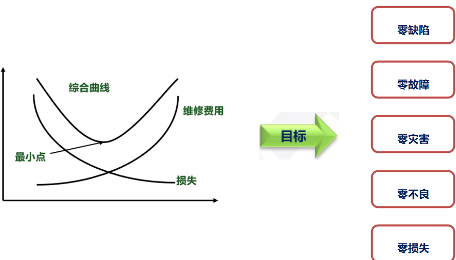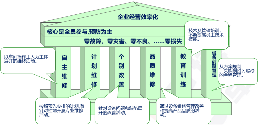 通过全员生产维护和持续改善,最大限度提高设备综合效率、延长设备使用寿命为目标,使生产效益最大化,最终实现零缺陷、零故障、零灾害、零不良、零损失 。