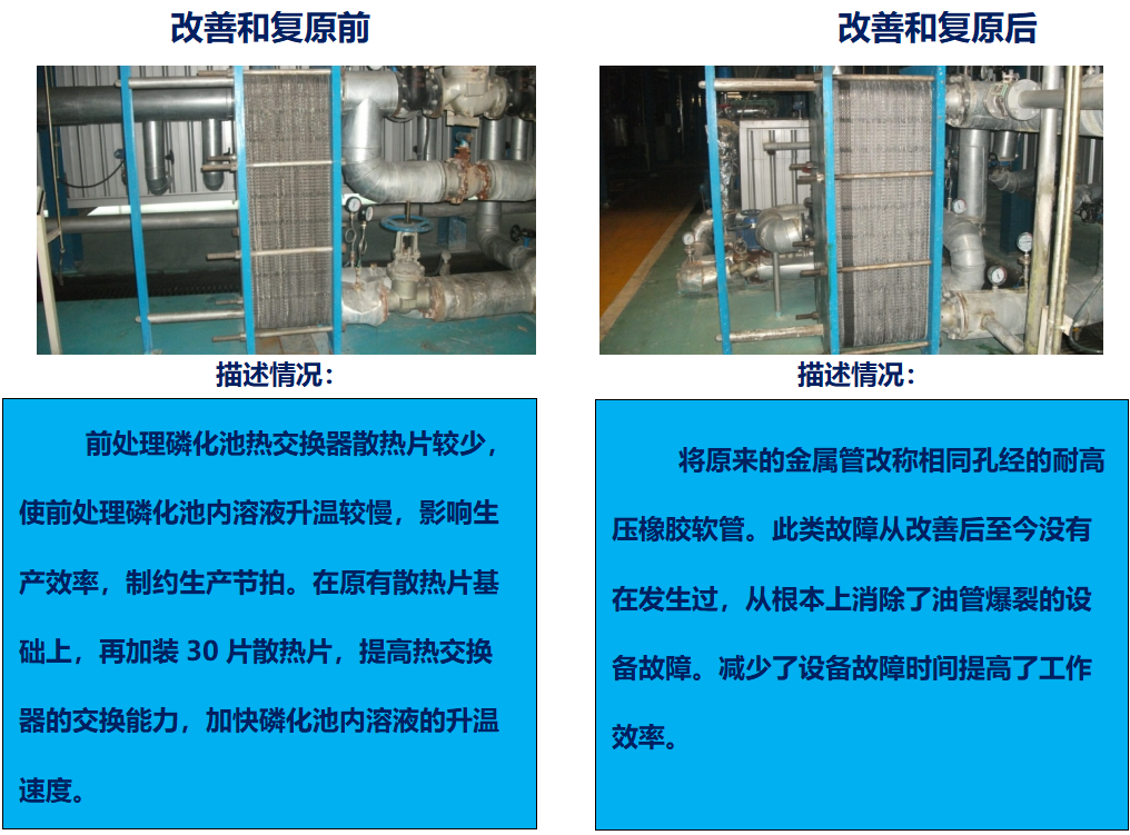 通过改善使前处理的生产效率提高了,以每辆车节约20秒的磷化时间,全年生产4.2万辆车计算,全年可减少开机时间:42000*15/(60*60)=175小时,前处理每小时能耗850元,每人每小时12元工资,前处理班组25人,则全年可为公司节约: (850 12*25)*175=201250元。
