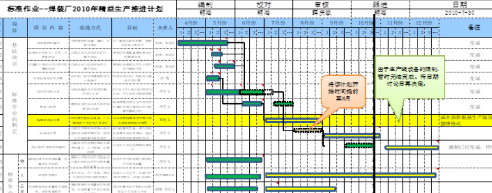 根据公司的经营目标及发展方向,提高厂能拉动生产已迫在眉睫;而要加快生产节拍必须先规范标准作业。标准作业是为了实现作业人员、作业顺序、工序设备的布置、物流过程等的最优化组合设立的作业方法。为了实现以低廉的成本生产出优质产品的一个作业基准,项目组首先定年度推进计划;